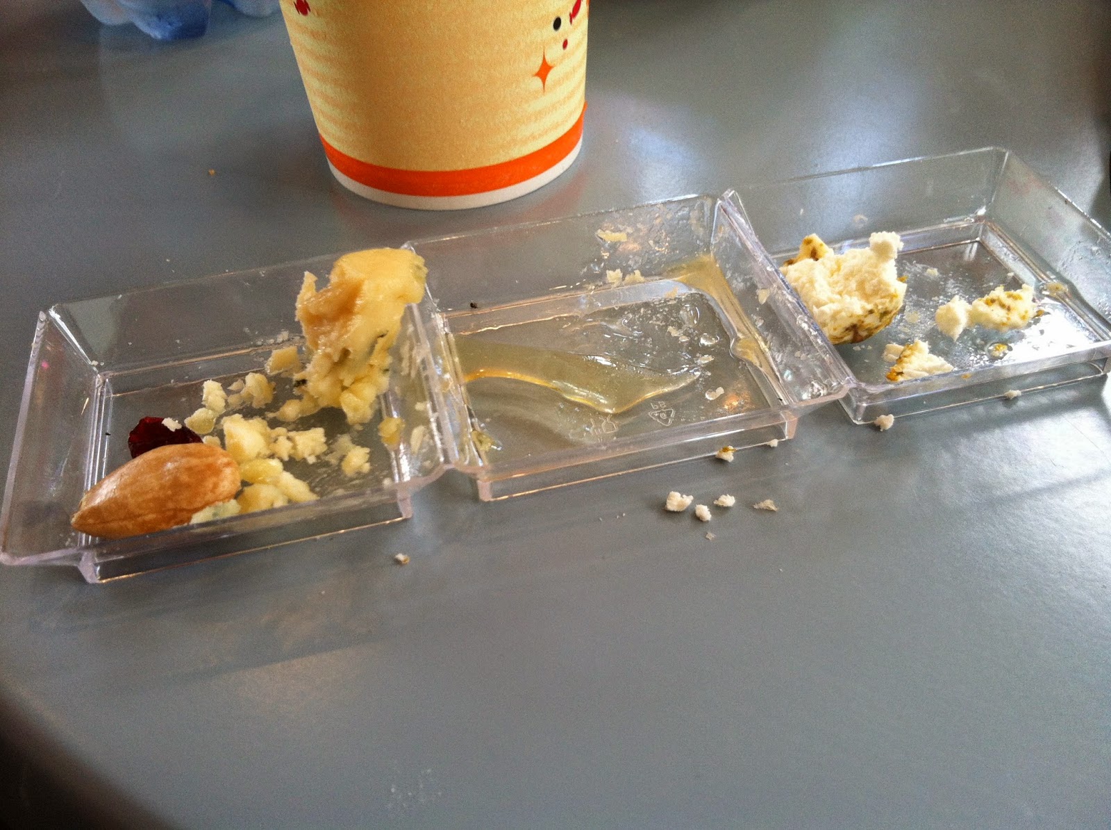 -Baklava * This is the item I was most anticipating. It is one of my most favorite desserts that I rarely have. So with a heavy heart I must tell you that this was THE most disappointing item at F&W. :( It had obviously been frozen and may have experienced frost bite because it tasted like paper and even the honey tasted bad. Just bad all around. Wal-Mart makes better baklava.